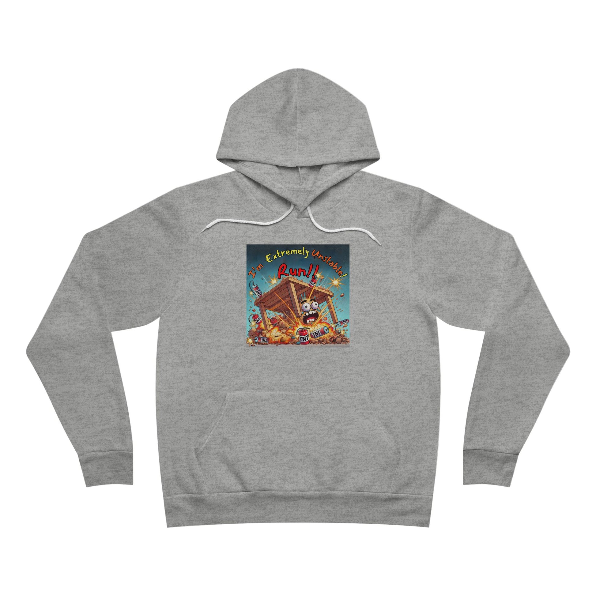 A comfortable and cozy hoodie featuring the text "I'm Extremely Unstable Run" with the "Stone Customs" logo on the back. Perfect for those looking for a casual and edgy vibe in their wardrobe. Ideal for adults and great for wearing during casual outings or lounging at home. Relevant for everyday wear, casual gatherings, and as a humorous gift for friends and family.